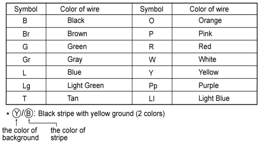 The following abbreviations are used to identify wire colors in the circuit schematics.