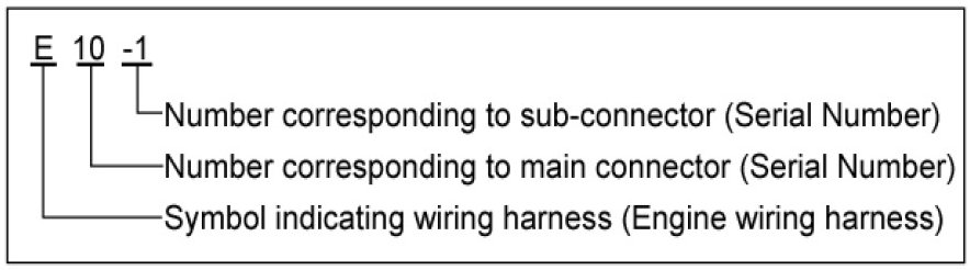 A Connector identification symbol consists of a wiring harness location classification symbol corresponding to a wiring harness location and number corresponding to the connector.