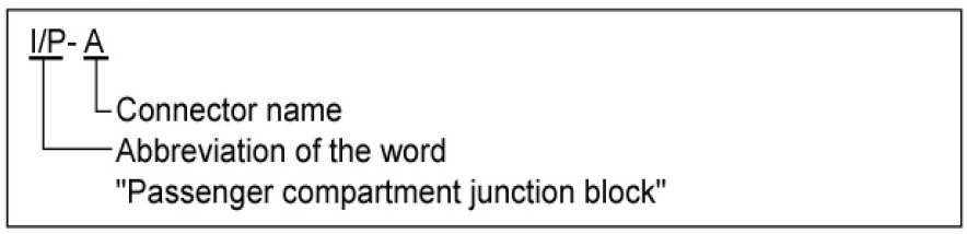 A junction block identification symbol consists of a wiring harness location classification symbol corresponding to a wiring harness location and number corresponding to the connector in the junction block.