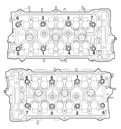 (3) Install and uniformly tighten the cylinder head bolts on each cylinder head in several passes and in the sequence shown, then repeat for the other side, as shown.