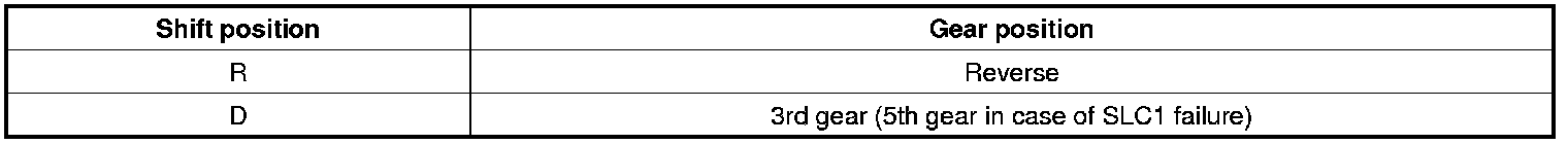 With the fail-safe function, if any malfunction should occur in the automatic transmission system, the TCU will output a control signal, and control will be performed to make traveling a minimum distance possible. If shift solenoid malfunction, the TCU will cancel the output of control signals to the solenoid. If this happens, automatic transmission gear shifting will be controlled by oil pressure circuits only and the gears will shift as shown in the chart below.
