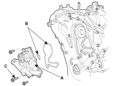 Install the water pump(A) and a new gasket(B) with 12 bolts.