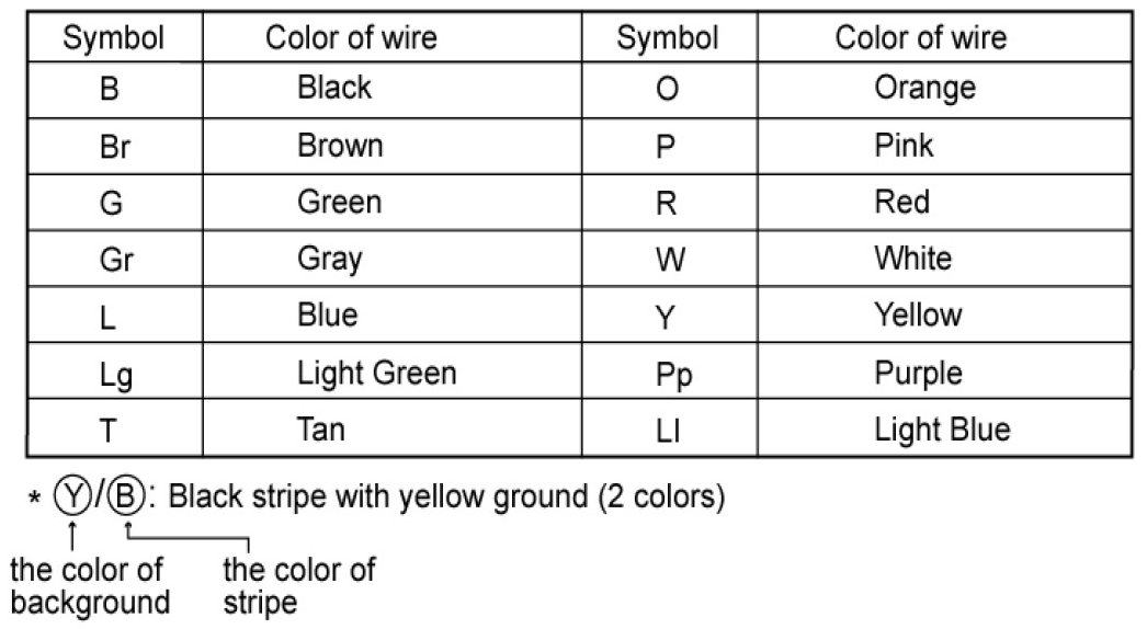 The following abbreviations are used to identify wire colors in the circuit schematics.