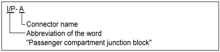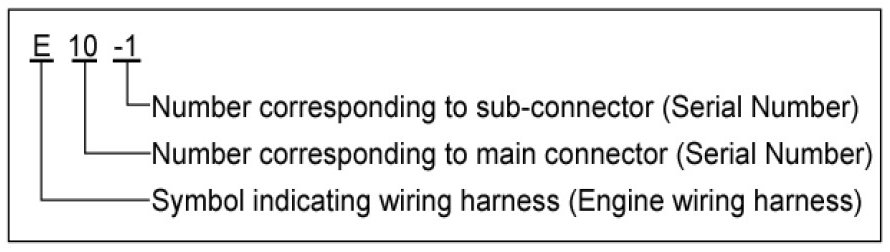 A connector identification symbol consists of a wiring harness location classification symbol corresponding to a wiring harness location and number corresponding to the connector.