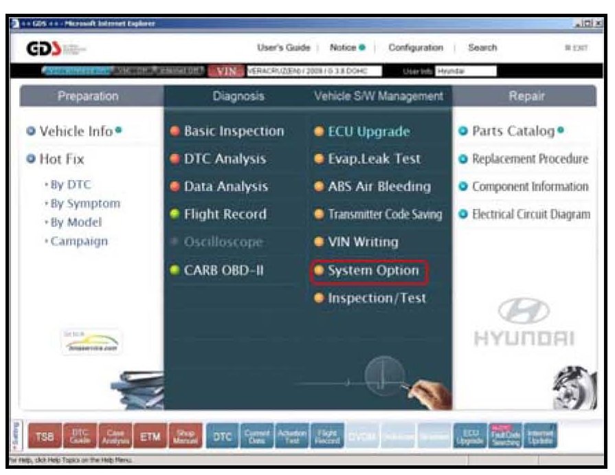 1. Connect the GDS unit to the vehicle and select the vehicle model and PIC (Smart Key Code Saving) option from the VIN screen.