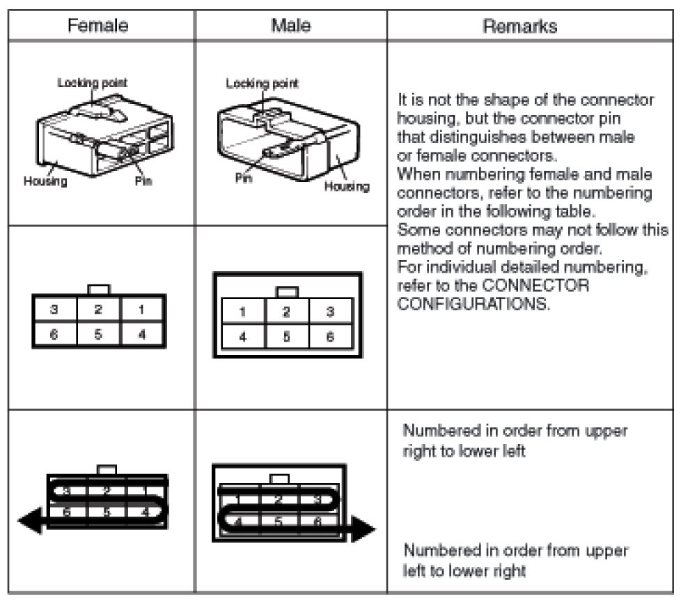- It shows the front of the connector on the harness side when not to the harness connector. The terminal number on each connector can be obtained by following the pattern used in (5) connector view and numbering order. Unused terminals are marked with an asterisk (*).
