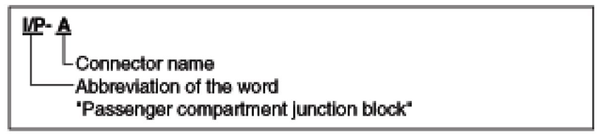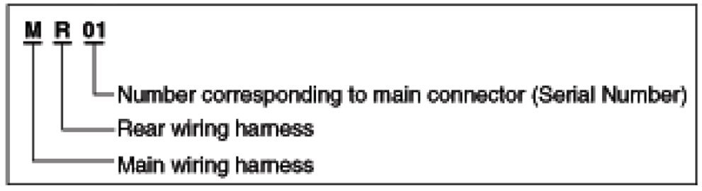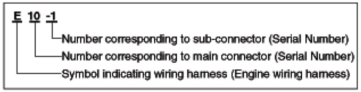 A Connector identification symbol consists of a wiring harness location classification symbol corresponding to a wiring harness location and number corresponding to the connector.