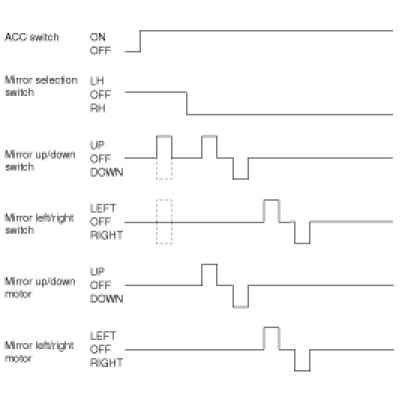 If the mirror direction switch (up, down, left and right) is pressed when mirror selection switch on driver side power window switch is in outside LH under ACC ON condition, then mirror motor moves to the corresponding direction.