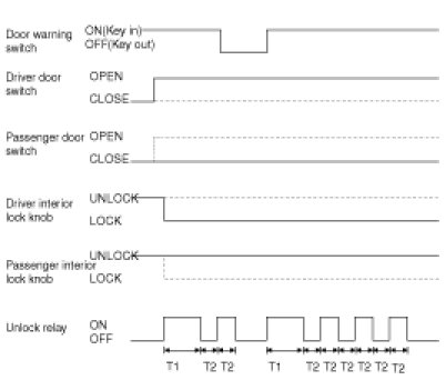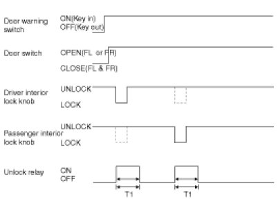 1. If the door switch of driver side or passenger side is locked when door warning switch is turned on and ( CAN communication reception), driver side or passenger side door is open, it executes unlock output for 1 second. If the passenger side door remains locked even after the unlock output, it repeats on and off 3 times with the time interval of 0.5 second.