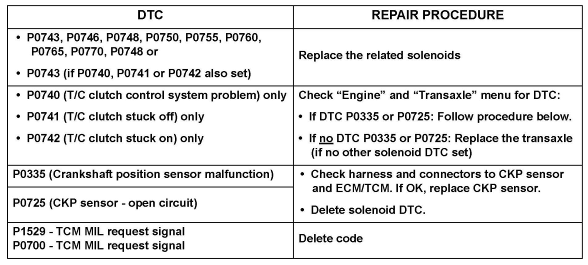 14. Clear the codes and test drive the vehicle for two driving cycles (two key-on to key-off driving cycles, including 1-2-3-4 upshifts and 4-3-2-1 downshifts). If the DTC returns, perform the repairs shown above.