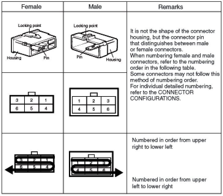 - It shows the front of the connector on the harness side when not to the harness connector. The terminal number on each connector can be obtained by following the pattern used in (5) connector view and numbering order. Unused terminals are marked with an asterisk (*).