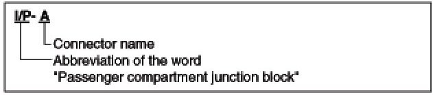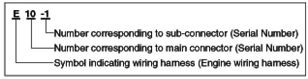A Connector identification symbol consists of a wiring harness location classification symbol corresponding to a wiring harness location and number corresponding to the connector.