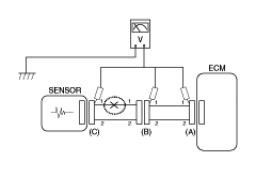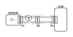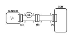 - With each connector still connected, measure the voltage between the chassis ground and terminal 1 of each connectors (A), (B) and (C) as shown in [Fig 4].