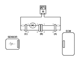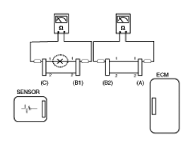 - Disconnect connector (B), and measure for resistance between connector (C) and (B1) and between (B2) and (A) as shown in [Fig 3].