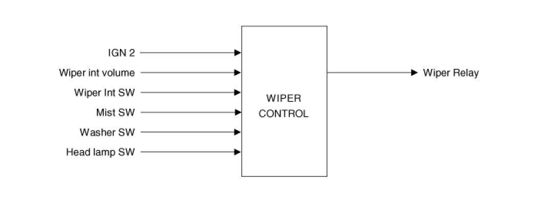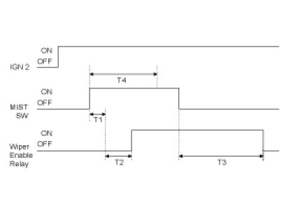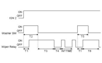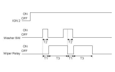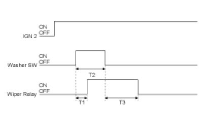 (1) Turn Wiper Relay ON after T1 when turning Washer SW ON at the status of IGN2 ON and if the input of Washer SW is more than 0.2sec, turn the output of Wiper Relay ON for 2.5 ~ 3.8sec after turning Washer SW OFF.