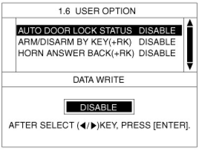 The BCM offers 3 items user option mode for a user convenience (AUTO DOOR LOCK, ARM/DISARM BY KEY, HORN ANSWER BACK)