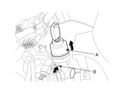 6. If it is necessary to remove the key lock cylinder (A), remove the key lock cylinder (A) after pushing lock pin (B) with key ACC.