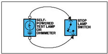 Use a self-powered test lamp or an ohmmeter to check for continuity.