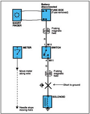 A short finder is available to locate a short to ground. The short finder creates a pulsing magnetic field in the shorted circuit and shows you the location of the short trough body trim or sheet metal.