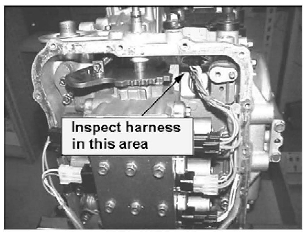 4. Check the harness inside the transaxle oil pan for a short circuit to ground. Replace the harness if damage is found or if three or more solenoid DTC are found in Step 1. (Refer to TSB#04-40-015 for replacement instructions).