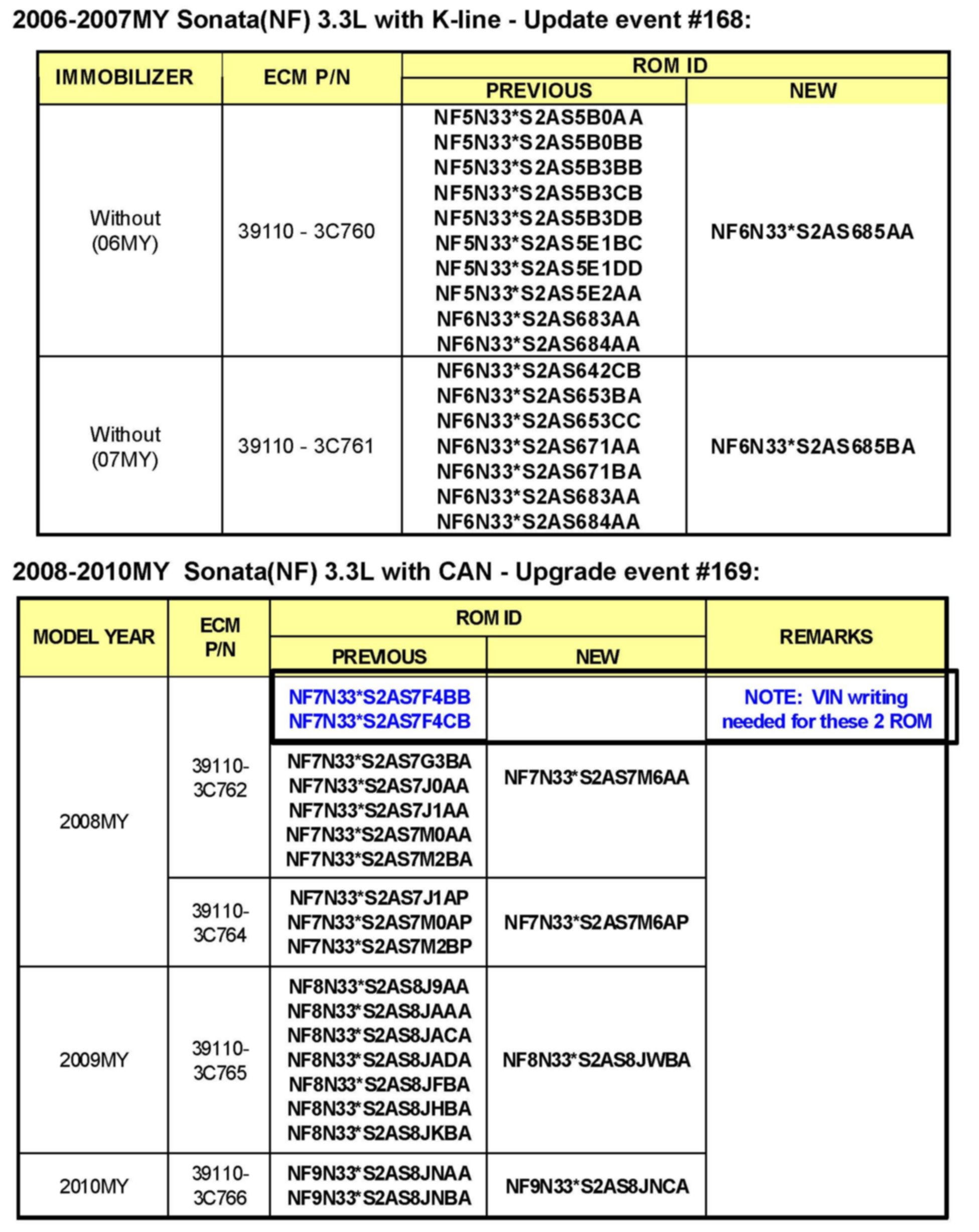 Refer to below tables for Santa Fe and Sonata as to applicable ROM-ID's for this TSB.