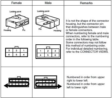 NOTE: Connectors which connect each wiring harness are represented by the following symbols.
