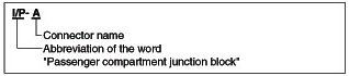 A junction block identification symbol consists of a wiring harness location classification symbol corresponding to a wiring harness location and number corresponding to the connector in the junction block.