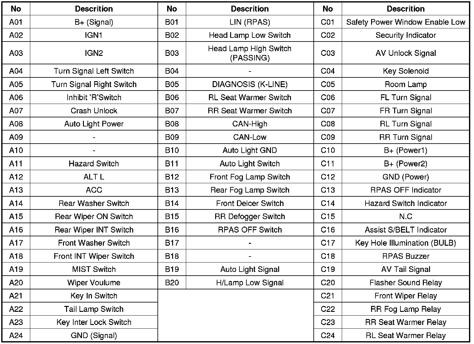 3. To consult the present input/out value of IPM, "Current DATA". It provides information of IPM input/output conditions of power supply, turn signal/brake lamp, headlamp, door locks, outside mirror, wiper, auto-light and transmitters etc.