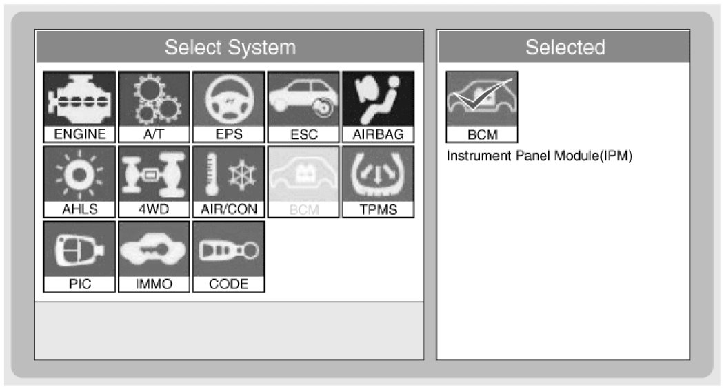 2. To diagnose the IPM function, select the vehicle model and IPM.