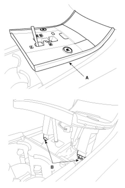 2. Remove the console under cover (A) and connectors (B).