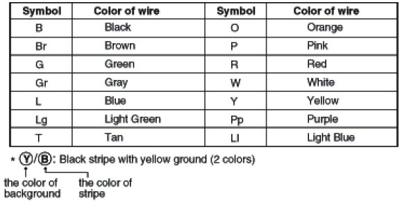 The following abbreviations are used to identify wire colors in the circuit schematics.