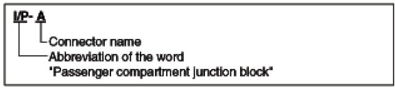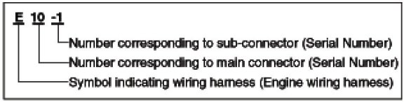 A Connector identification symbol consists of a wiring harness location classification symbol corresponding to a wiring harness location and number corresponding to the connector.