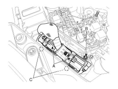 4. Unscrew the PCM bracket mounting bolt (B) and the nuts (C), and then remove the PCM.