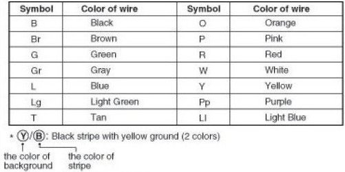The following abbreviations are used to identify wire colors in the circuit schematics.