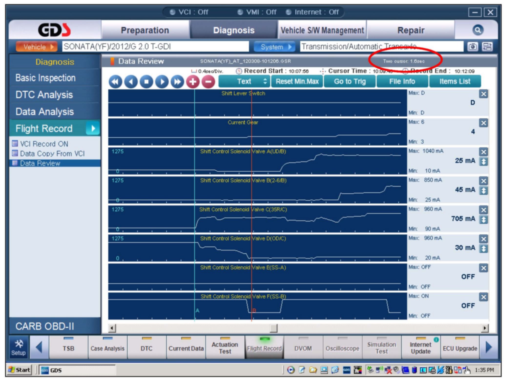 ^ Read the 35R/C solenoid elapsed time at the top right of the screen. If the P-R shift requires more than 2.5 seconds, refer to TSB 11-AT-008-1, "Reset and Relearn Adaptive Values":