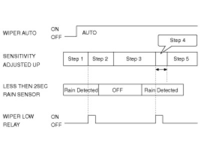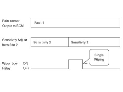 (4) The drive may adjust the rain sensor performance by adjusting the sensitivity input. When in automatic mode, the BCM will perform a single wipe each time the sensitivity is adjusted upward to a more sensitive setting (downward more then one step). This single wipe will only be performed if Rain Detected signal is being received from the Rain sensor. If the sensitivity adjustment is adjusted upward more than one sensitivity, the BCM will only perform a single wipe unless the time between Increases is more than 2 seconds.