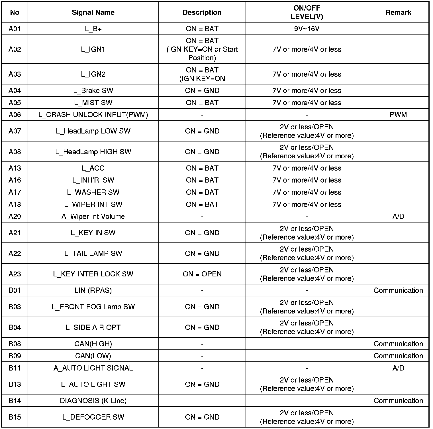 BCM Input Signal Specification