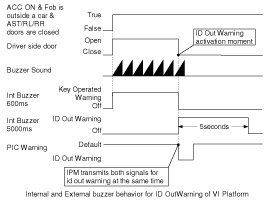 While the valid Fob is not inside car, if all doors are closed at IGN or ACC state, the buzzer warning (external and internal) sound is activated for 3sec.