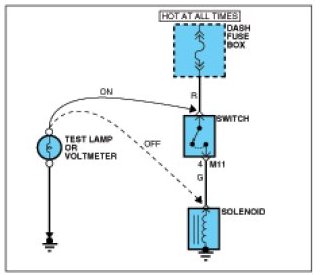 A. Connect one lead of a test lamp or voltmeter to a ground. If you are using a voltmeter, be sure it is the voltmeter's negative test lead you have connected to ground.