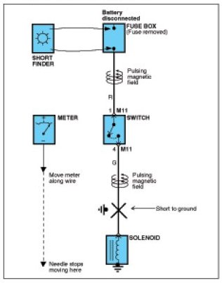 A short finder is available to locate a short to ground. The short finder creates a pulsing magnetic field in the shorted circuit and shows you the location of the short through body trim or sheet metal.