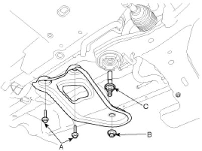 12. Remove the sub frame stay mounting bolts (A), nuts (B) and the sub frame mounting bolts (C) by supporting it with a jack.