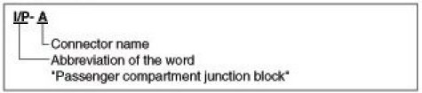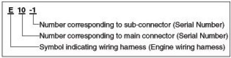 A Connector identification symbol consists of a wiring harness location classification symbol corresponding to a wiring harness location and number corresponding to the connector.