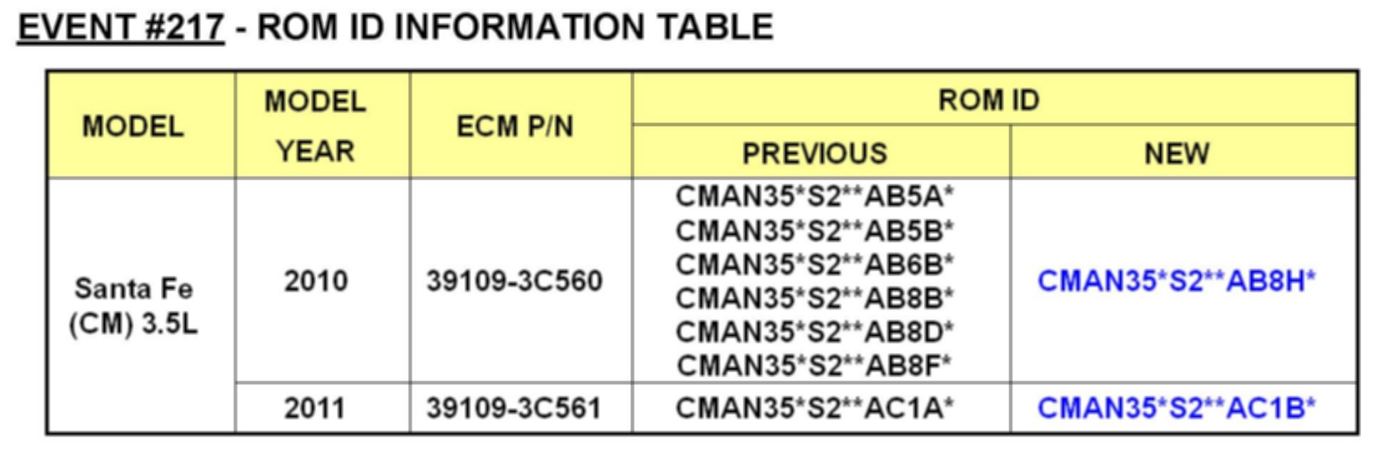 This bulletin provides the procedure to update the Engine Control Module (ECM) of some 2010-2011 MY SANTA FE (CM) 3.5L vehicles which may experience malfunction indicator lamp illuminated with the ECM (Electronic Control Module) system-related DTC P0017.