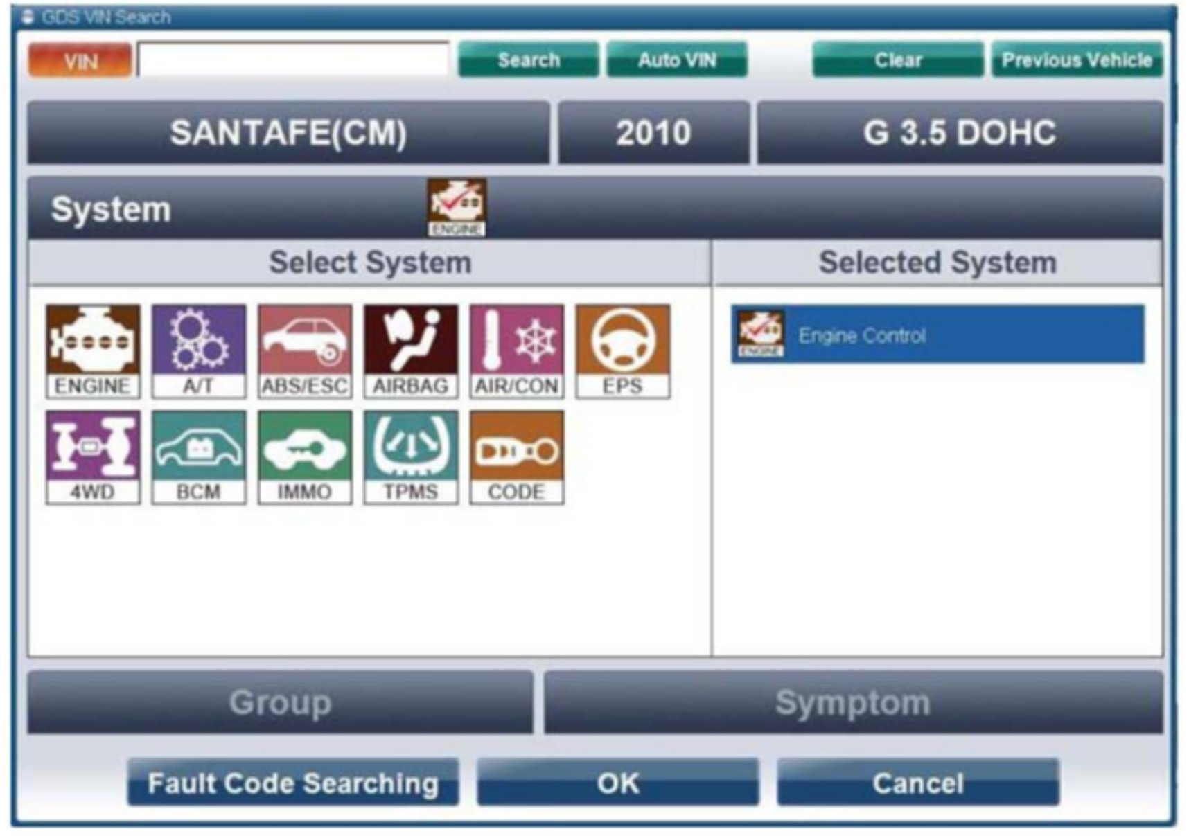 2. Enter the vehicle information by pressing the VIN Auto Detect button, entering the vehicle's VIN or selecting the vehicle model, model year, engine/fuel type and ENGINE as the system and then click OK.