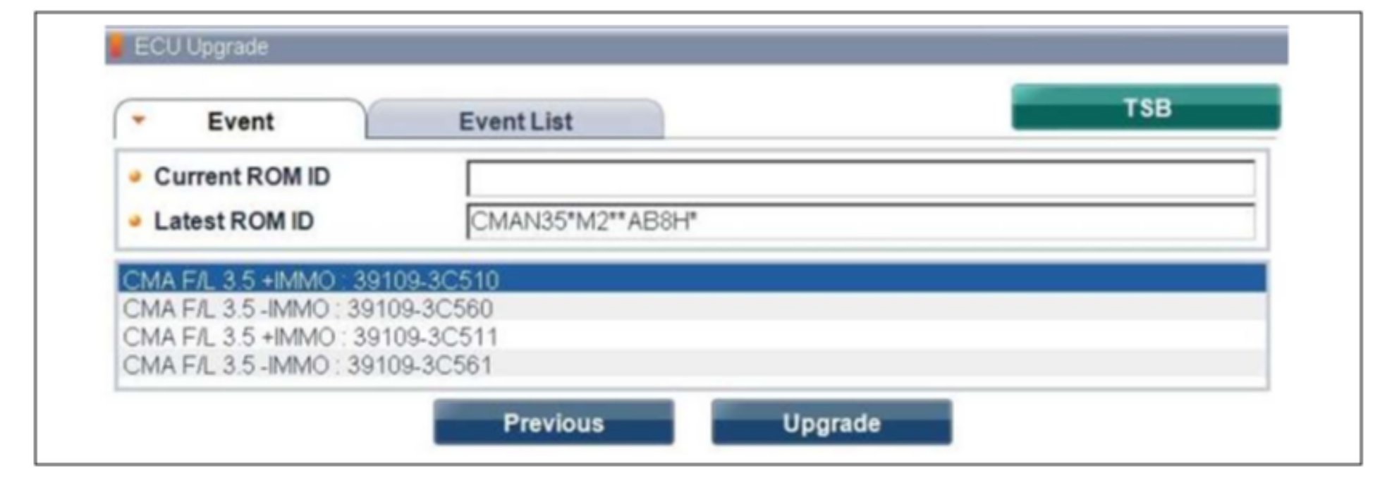 7. After the Current ROM ID is displayed, select the Update Event "217.CMA F/L 3.5 P0017 DTC LOGIC IMPROVEMENT."