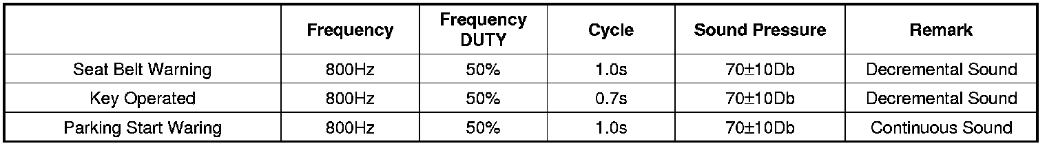 In the state that the IGN1 is ON or the Parking Brake is pulled, if the speed of vehicle is maintained over 10 km/h for 2 - 3 seconds or more, then the Chime Buzzer output shall be continued with 1 second cycle of the ON/OFF (0.3/0.7 seconds). But, after the speed of vehicle is maintained over 10 km/h for 2 - 3 seconds or more, if the Parking Brake is pulled, output immediately.
