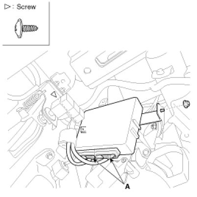 4. Remove the body control module after loosening nut (1EA) and screw (1EA) and disconnecting the connectors (A).