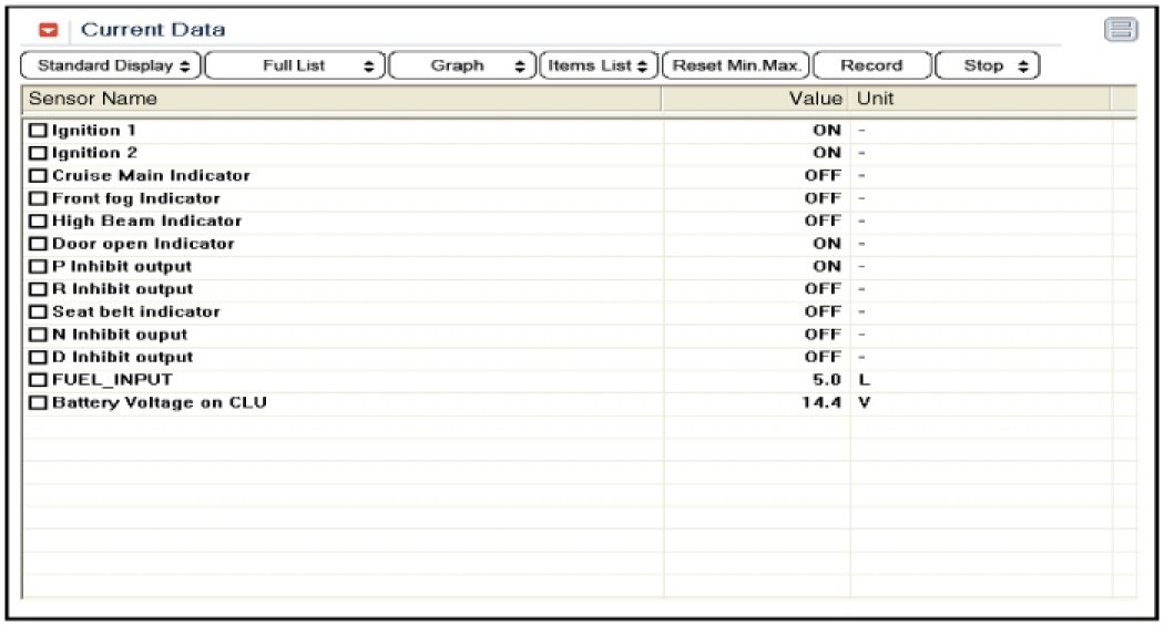 3. To consult the present input/output value of BCM, "Current DATA". It provides information of BCM input/output conditions of power supply, turn signal/brake lamp, headlamp, door, locks, outside mirror, wiper, auto-light and transmitters etc.