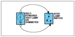 Use a self-powered test lamp or an ohmmeter to check for continuity.