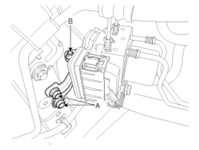 4. Loosen the ESC HECU bracket bolts (A) and nut (B), then remove HECU and bracket.